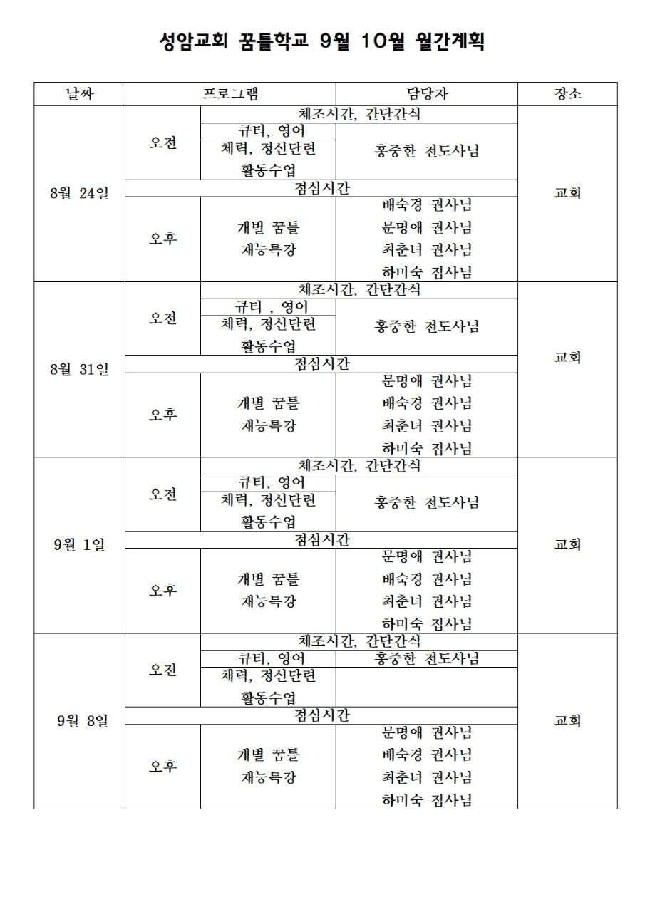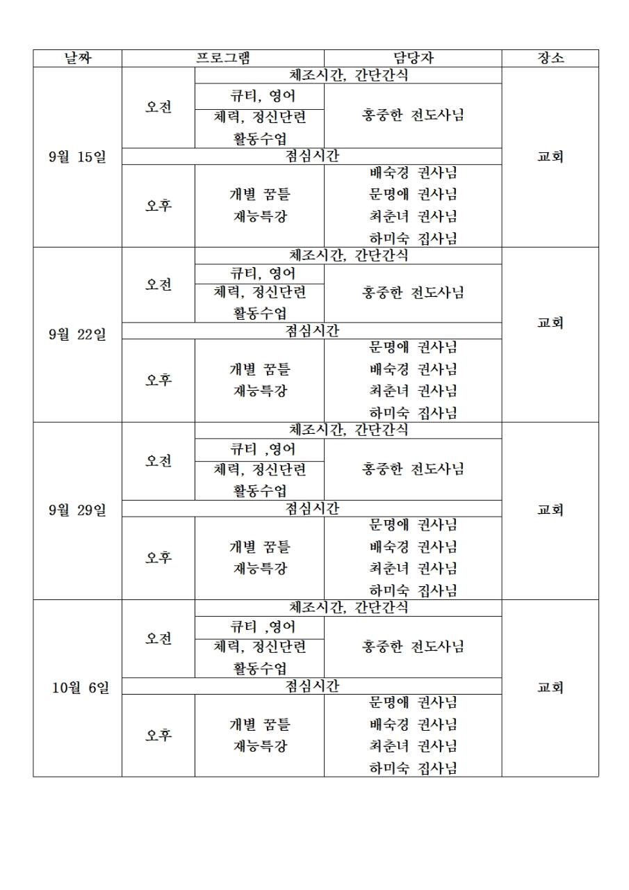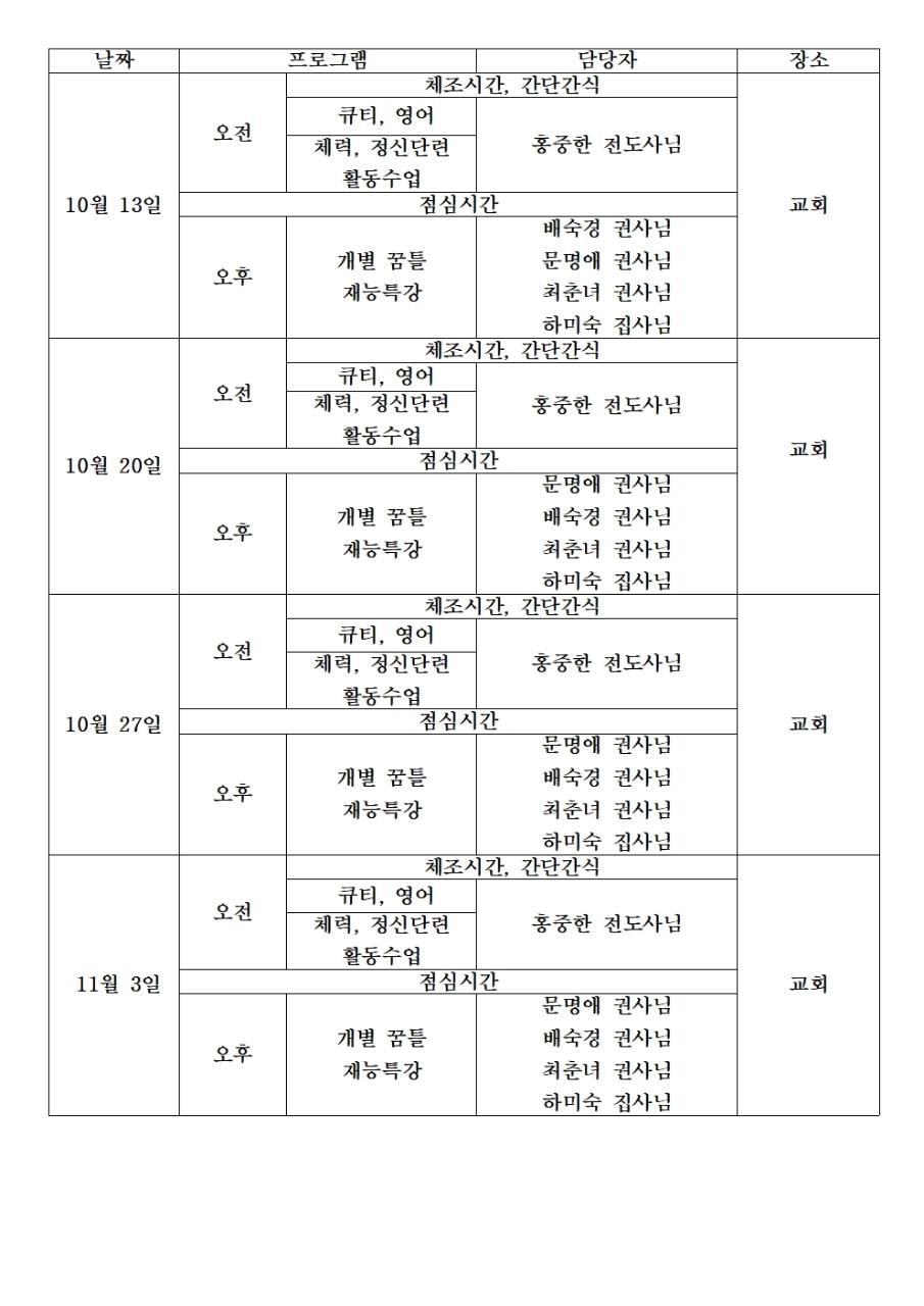 돌봄학교, 구연동화, 놀이문화교실, 제자학교, 큐티학교, 성품학교, 풍선만들기, 종이접기, 텃밭가꾸기, 과학교실, 독서활동 등